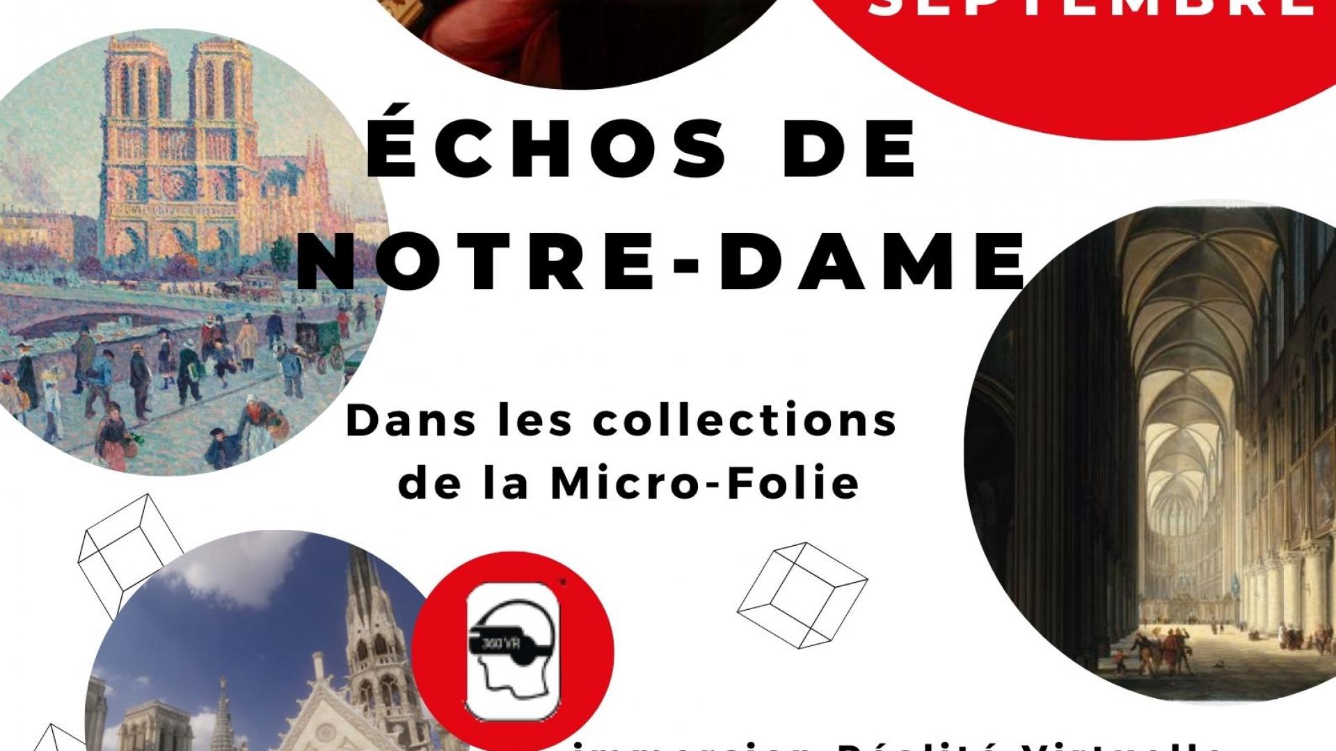 Echos de Notre Dame Echos de Notre Dame Publié le 29 août 2025 / Dernière modification le 29 août 2025 Echos de Notre Dame Publié le 29/08/2025 - Dernière modification le 29/08/2025 Echos de Notre Dame Du 2 au 30 Septembre Dans les collections de la Micro-Folie Immersion Réalité Virtuelle « Notre Dame de Paris » par Ubisoft