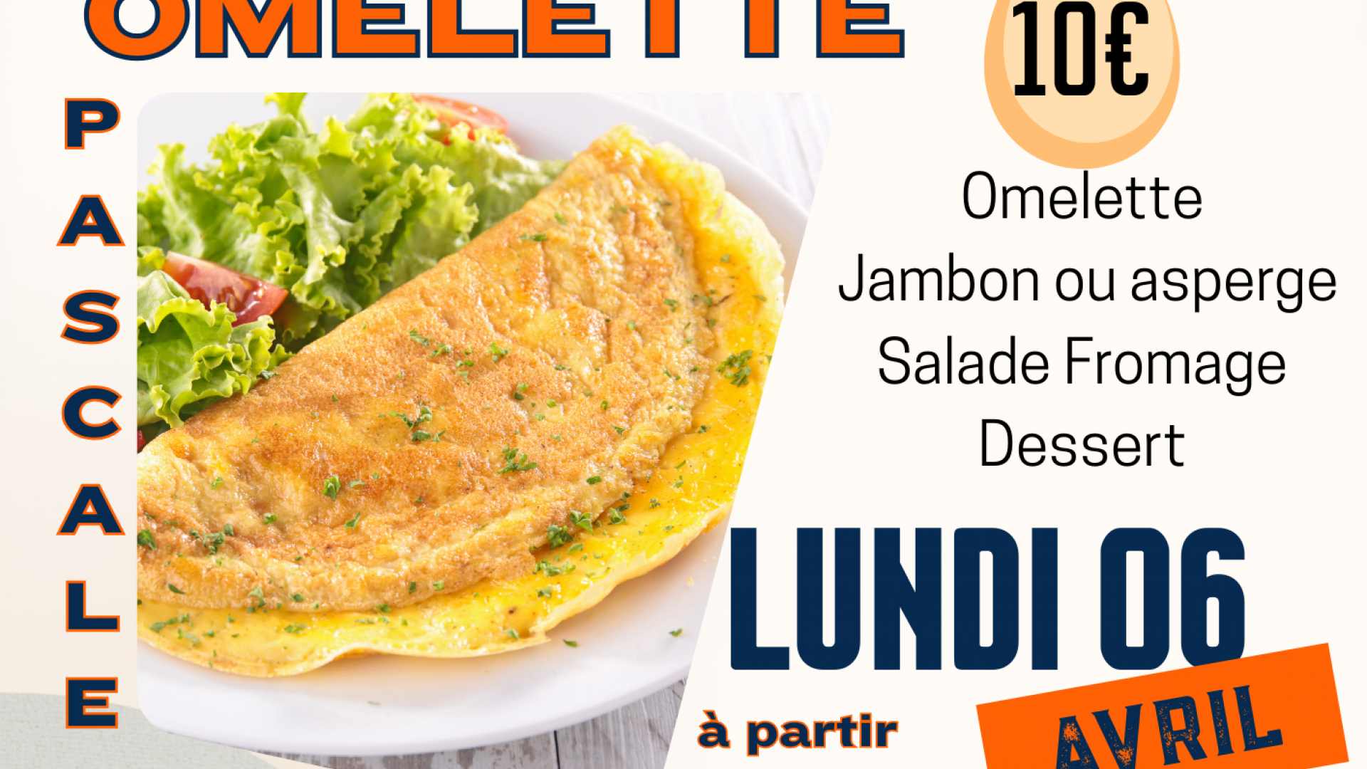 Omelette / Jambon ou asperge / Salade fromage / Dessert