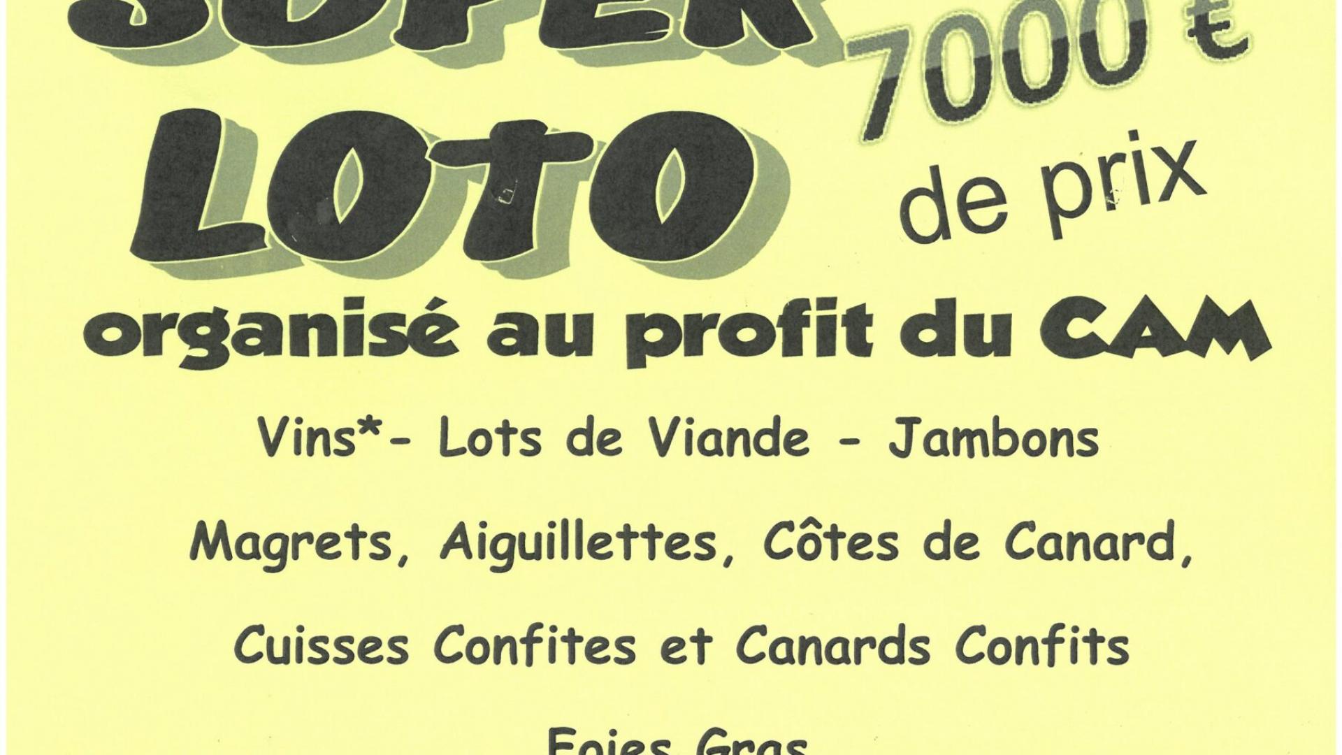 Venez découvrir le super loto du CAM ! 7000€ de prix. Possibilité de restauration avec vente de pâtisseries, sandwichs et buvette. 1 carton : 3 € euros – 5 cartons : 8 € et 10 cartons : 16 €