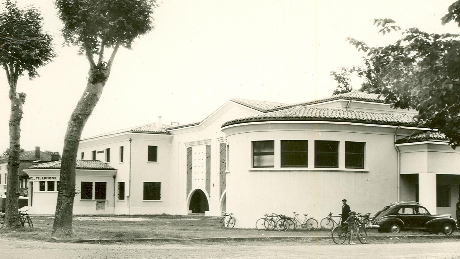 Ils sont deux des éléments principaux d’un complexe municipal voulu par les élus de la commune en 1936. Il était prévu, côté sud : un marché couvert faisant aussi office de fronton, une bibliothèque populaire, un dispensaire, un cercle de la jeunesse également salle de musique ; côté nord : une nouvelle mairie et justice de paix, une nouvelle salle des fêtes, un garage municipal pour le matériel d’incendie et une bourse du travail. L’avant-projet et le début des travaux sont dus à l’architecte montois Franck Bonnefous. La Seconde Guerre mondiale les interrompt et ils s’achèvent au début des années 1950, sous la direction d’André Bergès, architecte célèbre par son style basco-landais.